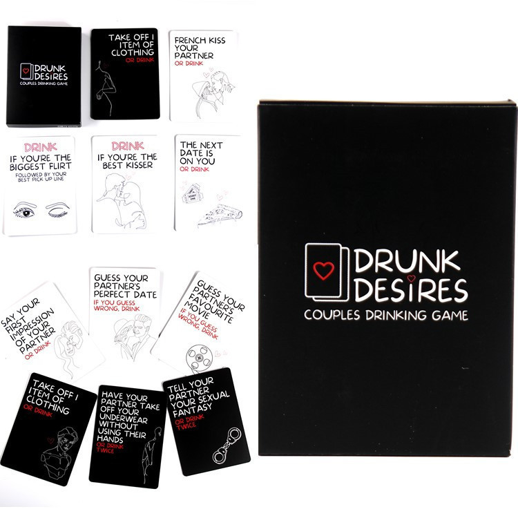 The “Drunk Desires” card game is a playful and seductive way to spice up date nights or intimate gatherings. With a total of 50 cards—28 Dirty (Black) cards and 22 Flirty (White) cards—this game is designed to bring laughter, intimacy, and passion into your relationship. Each card offers a unique challenge or action, with Dirty cards adding a bold, daring twist and Flirty cards encouraging sweet or playful gestures.